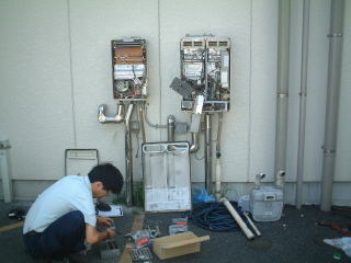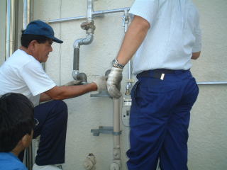 <給湯リモコン用IV線を天井引き回し中> <天吊り式ガス露出配管> <外側配管例> <配管調整> <圧力検査> <給湯機設置工事例> <既設給湯機のバーナー交換> <都市ガスメーターからLPメーターへの交換> 戻る